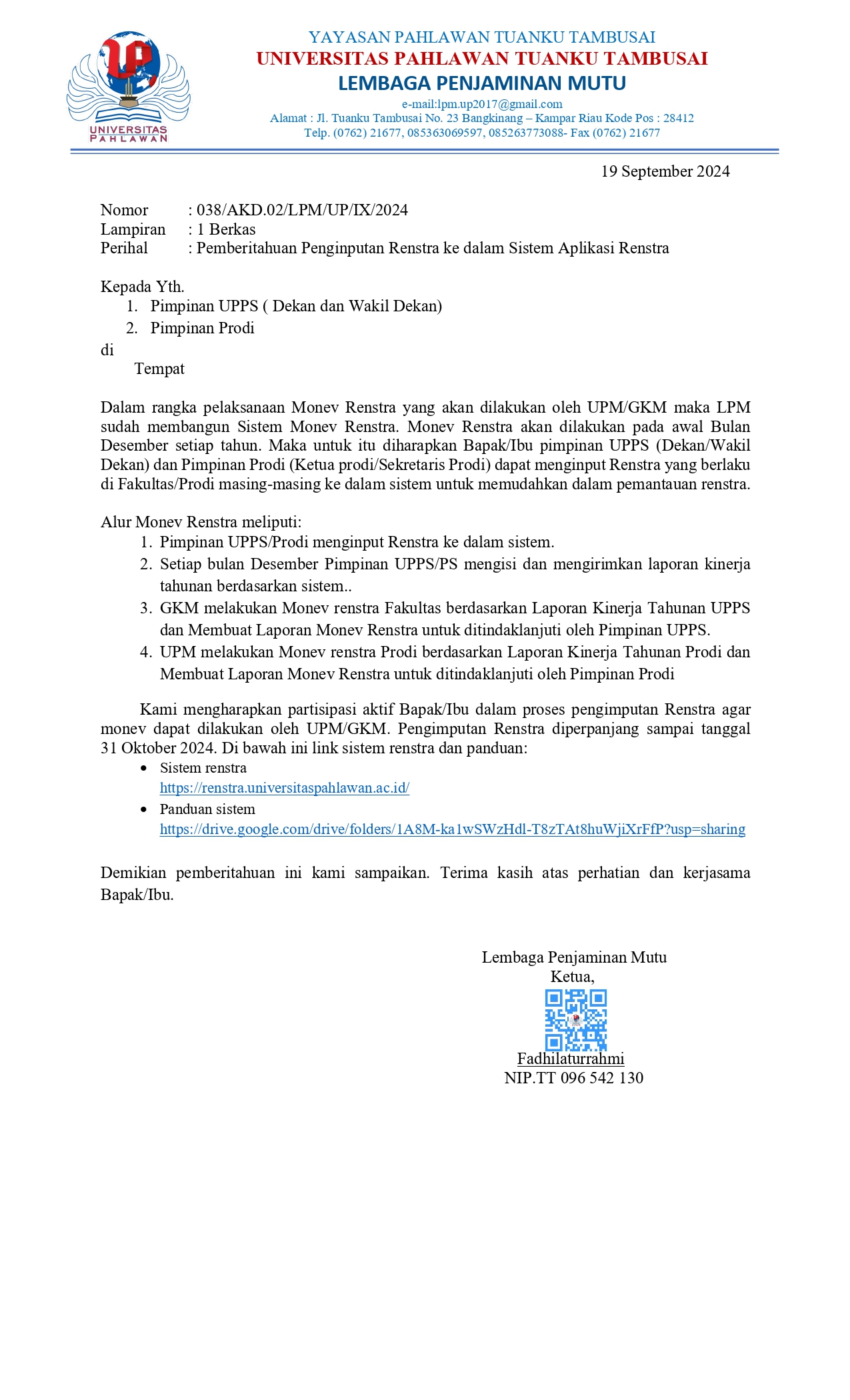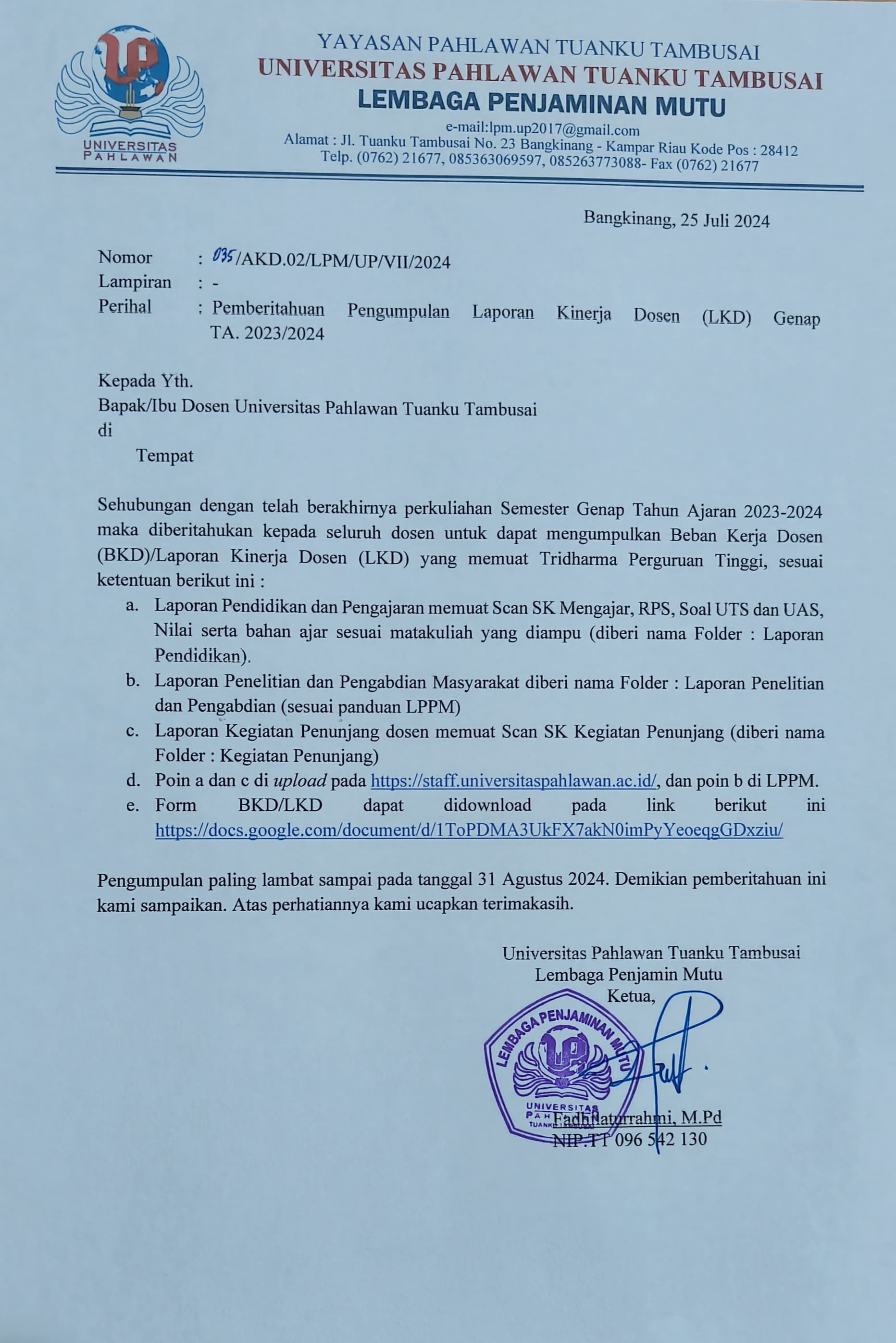 Akhirnya semoga Lembaga Penjaminan Mutu Universitas Pahlawan Tuanku Tambusai dapat mewujudkan penjaminan mutu pendidikan tinggi yang baik dan berkelanjutan