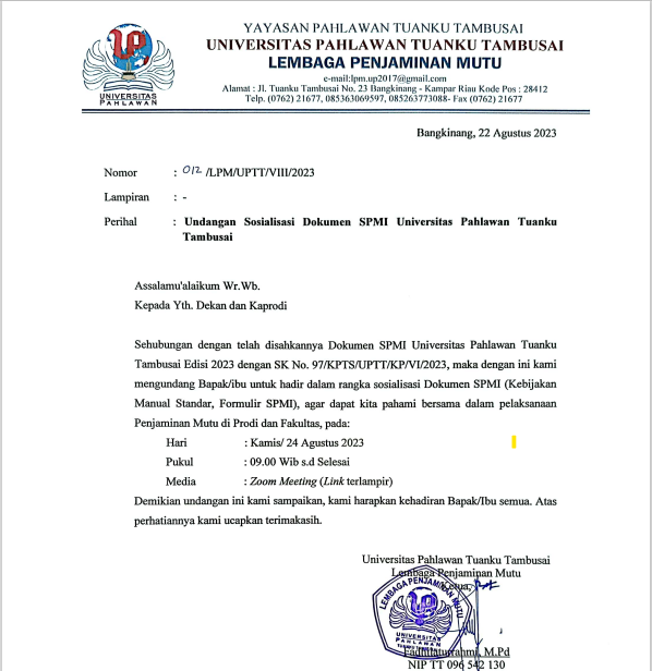 Universitas Pahlawan, 22 Agustus 2023 - Telah terlaksanakan Kegiatan Sosialisasi Dokumen SPMI UPT...